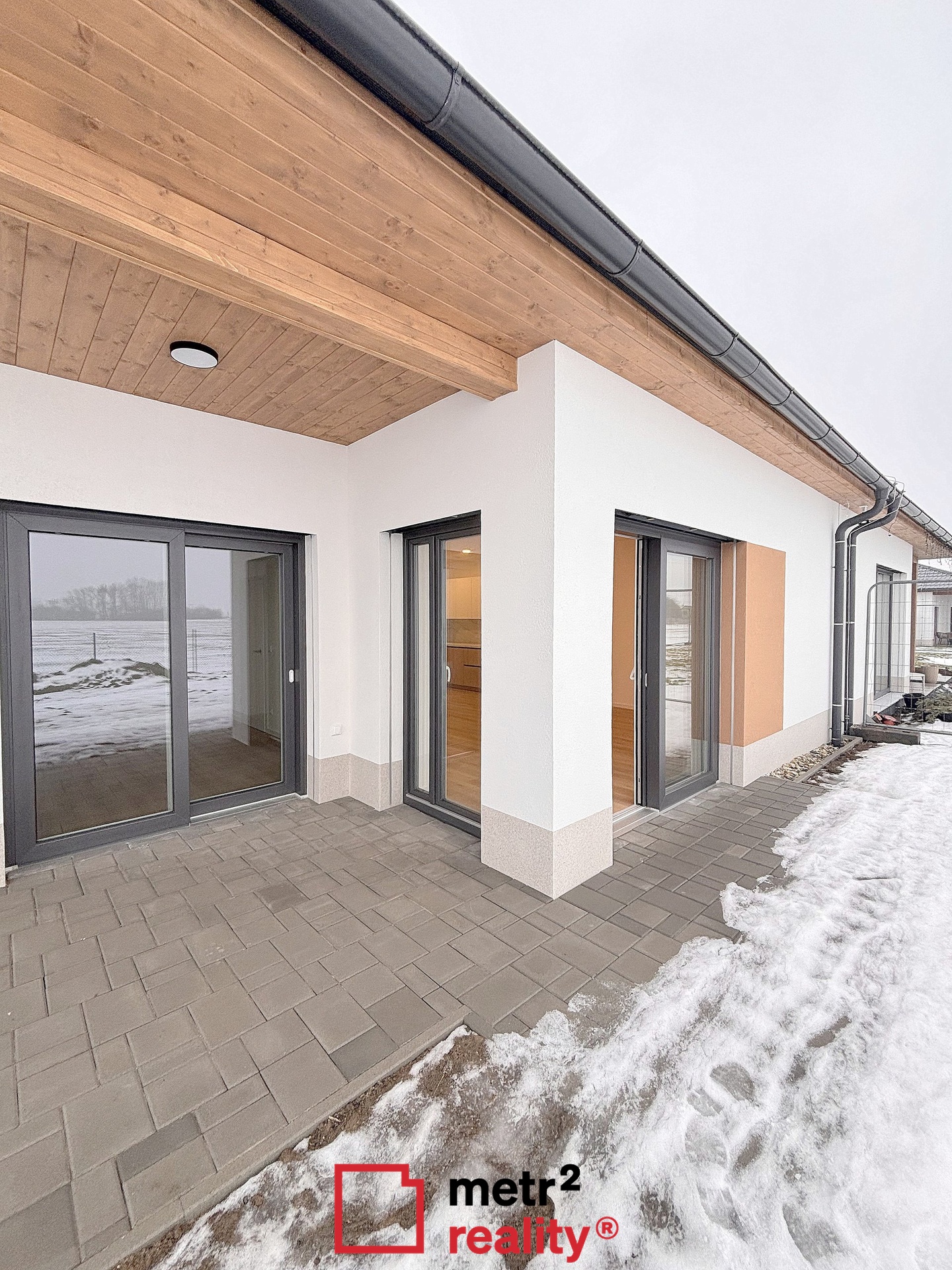 Nabízíme Vám k pronájmu moderní novostavbu zděného přízemního pasivního rodinného domu v obci Hnojice. Dispozice domu je 4+kk s celkovou užitnou plochou 97 m2 a pozemkem o celkové výměře 633 m2. Dům v řadové zástavbě s terasou 25 m2 je nepodsklepený, ze které je krásný výhled na Jeseníky. Vytápění domu je řešeno pomocí teplovodního systému, který obsahuje tepelné čerpadlo typu vzduch-voda, které zajišťuje pokrytí tepelných ztrát objektu. Součástí tepelného čerpadla je i zásobník na TUV. Ve všech místnostech RD je podlahové vytápění, které je v koupelně doplněno o topný žebřík. Součástí systému je také centrální rekuperační jednotka, jež zajišťuje přívod čerstvého vzduchu do obytných místností a odvod znehodnoceného (odpadního) vzduchu z koupelny, WC a kuchyně. FVE elektrárna, 3 panely na střeše, jednofázový střídač. Na zahradě je umístěna retenční podzemní nádrž pro sběr a následné využití dešťové vody s kapacitou 8 m3. Dešťová voda je využita na splachování WC a zálivku zahrady. Dům je napojen na vodu z lokálního zdroje, kanalizace obecní. Komfortní parkování pro dvě vozidla před domem s nabíjecím systémem pro elektro vozy. Cena nájemného činí 30.000 Kč měsíčně +2.500 inkaso. Dům je volný od 1.2.2026. PENB skupiny A.