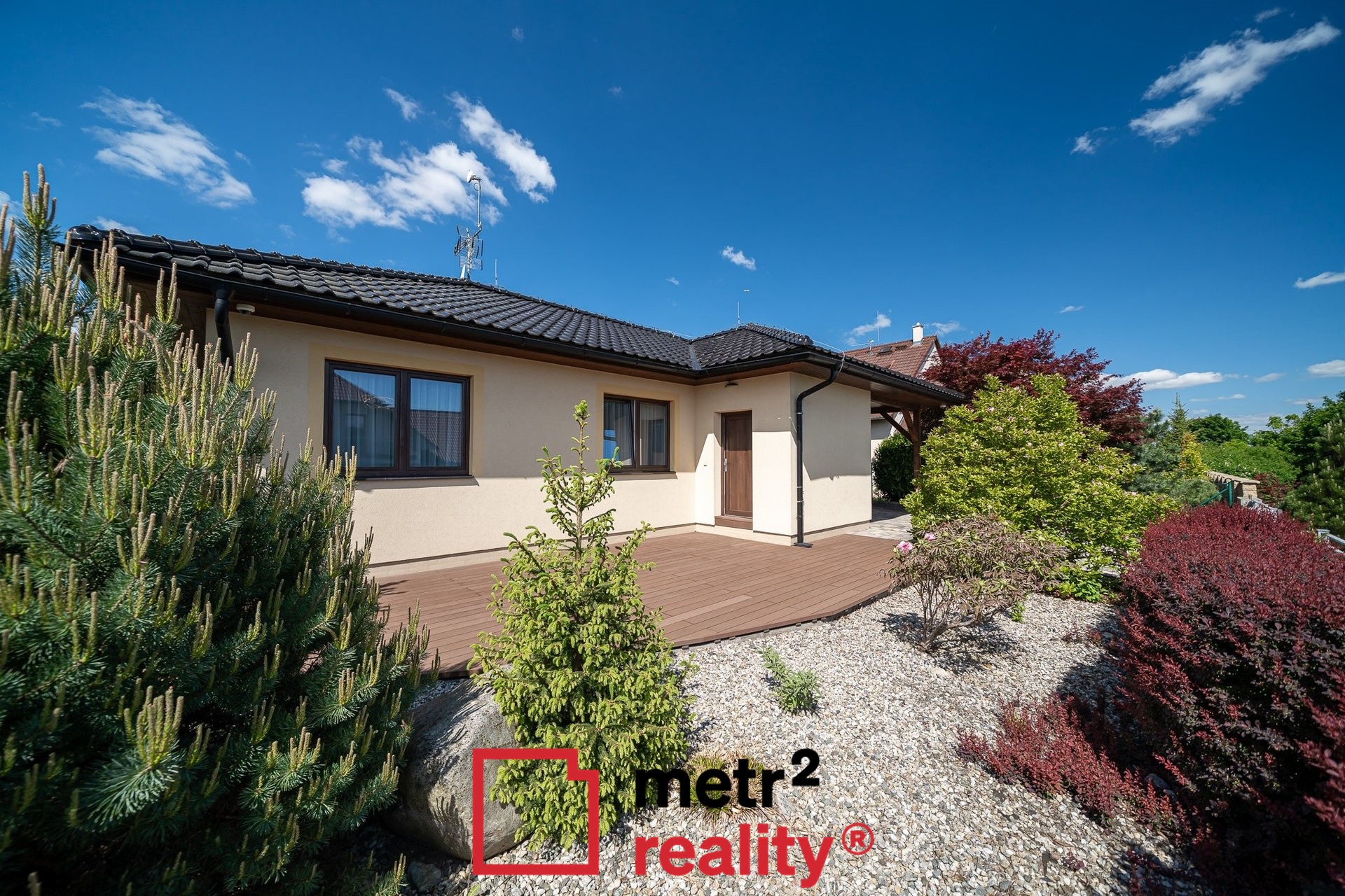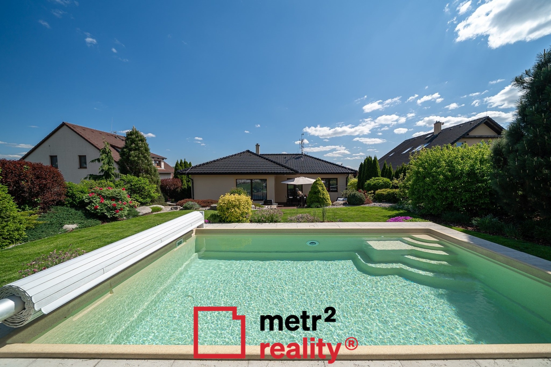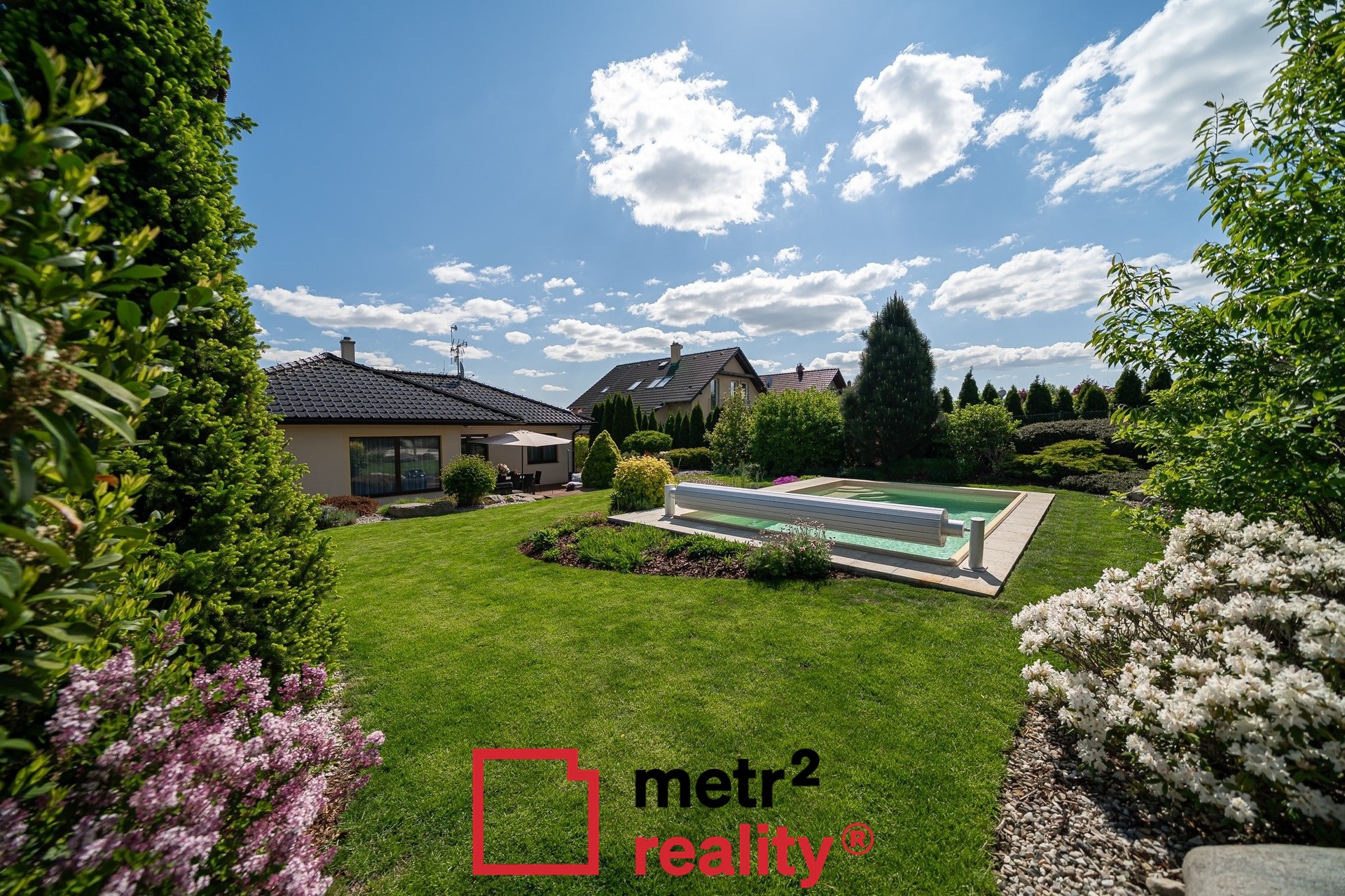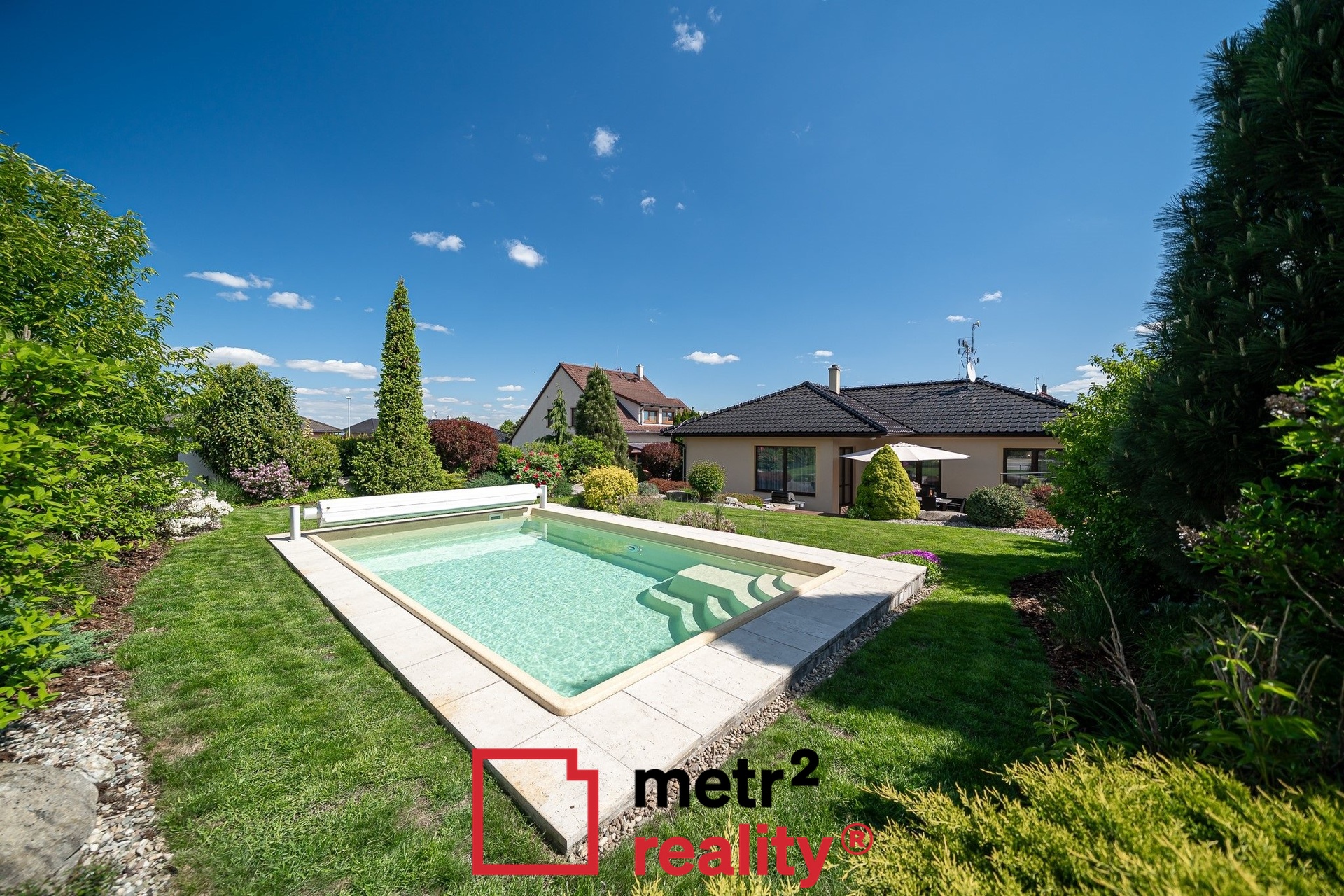 Dominantou nemovitosti je pečlivě udržovaná, vzrostlá okrasná zahrada s vyhřívaným keramickým bazénem (6,5 × 3,8 x 1,5 m, slaná voda, zakrytí roletou) a prostornou terasou ideální pro relaxaci. Na pozemku i před ním dostatek parkovací plochy, jedno kryté parkovací stání (přístřešek před vstupem do domu 15,93 m2).