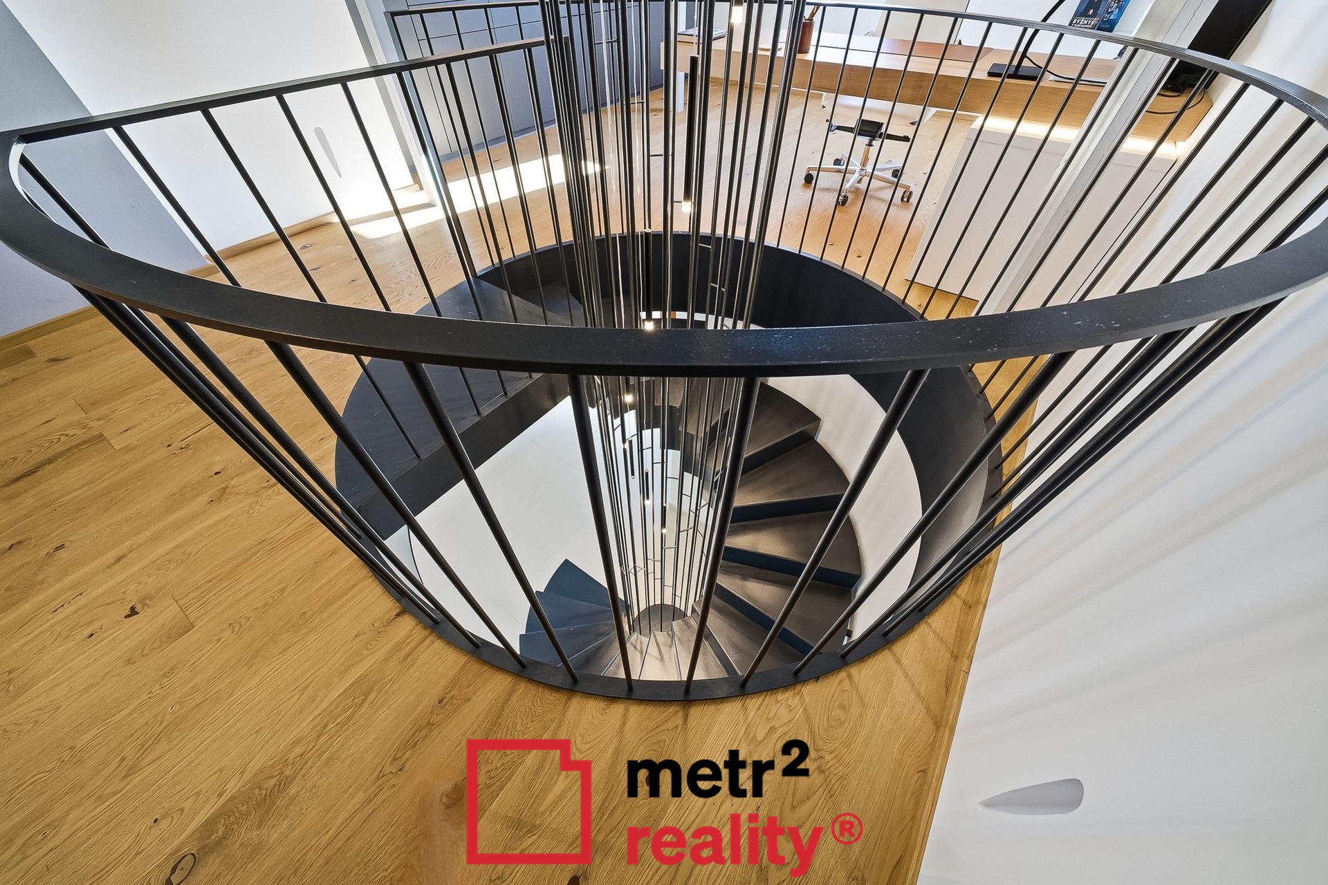 Do podkroví vás zavede kruhové ocelové vřetenové schodiště s průměrem cca 2150 mm.