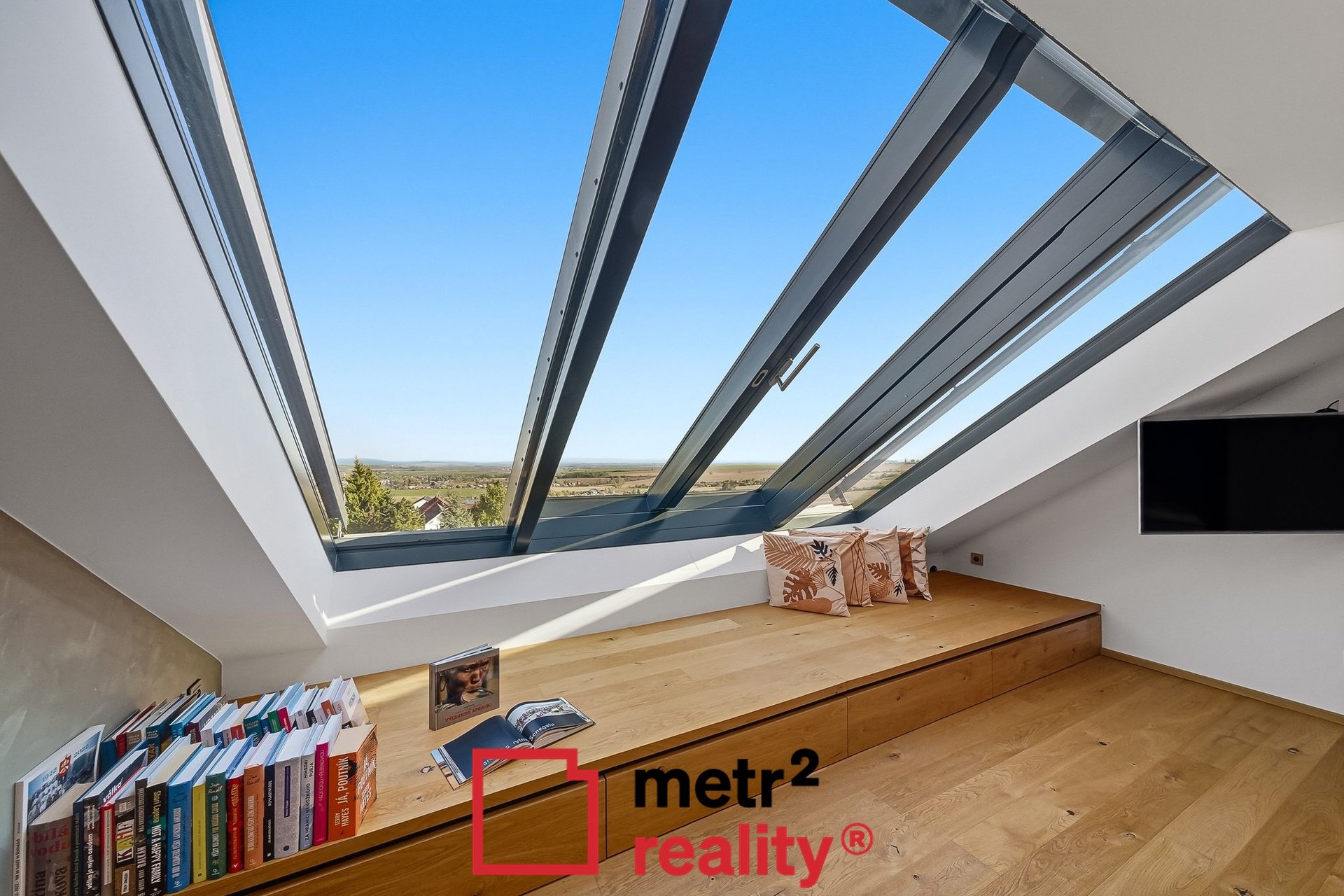 Hlavní ložnice v podkroví je východně orientovaná a nabízí úchvatný výhled do krajiny skrze velké prosklení střechy s posuvnými křídly.